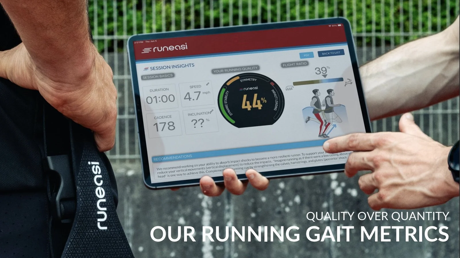 Using Runeasi, we can measure key aspects of your running mechanics: impact loading, dynamic stability, and symmetry. Impact loading shows how quickly and how much force travels through your body with each step. Dynamic stability reflects how well you control your trunk and pelvis while moving. Symmetry reveals differences between your right and left sides, helping highlight subtle imbalances that are hard to see with the naked eye.